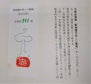 天野 忠詩集「動物園の珍しい動物 350部限定版(署名落款入り)」を買取らせていただきました。